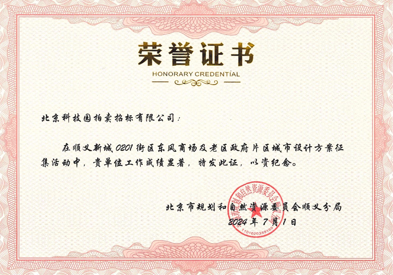 順義新城 0201街區(qū)東風(fēng)商場及老區(qū)政府片區(qū)城市設(shè)計方案征集榮譽證書