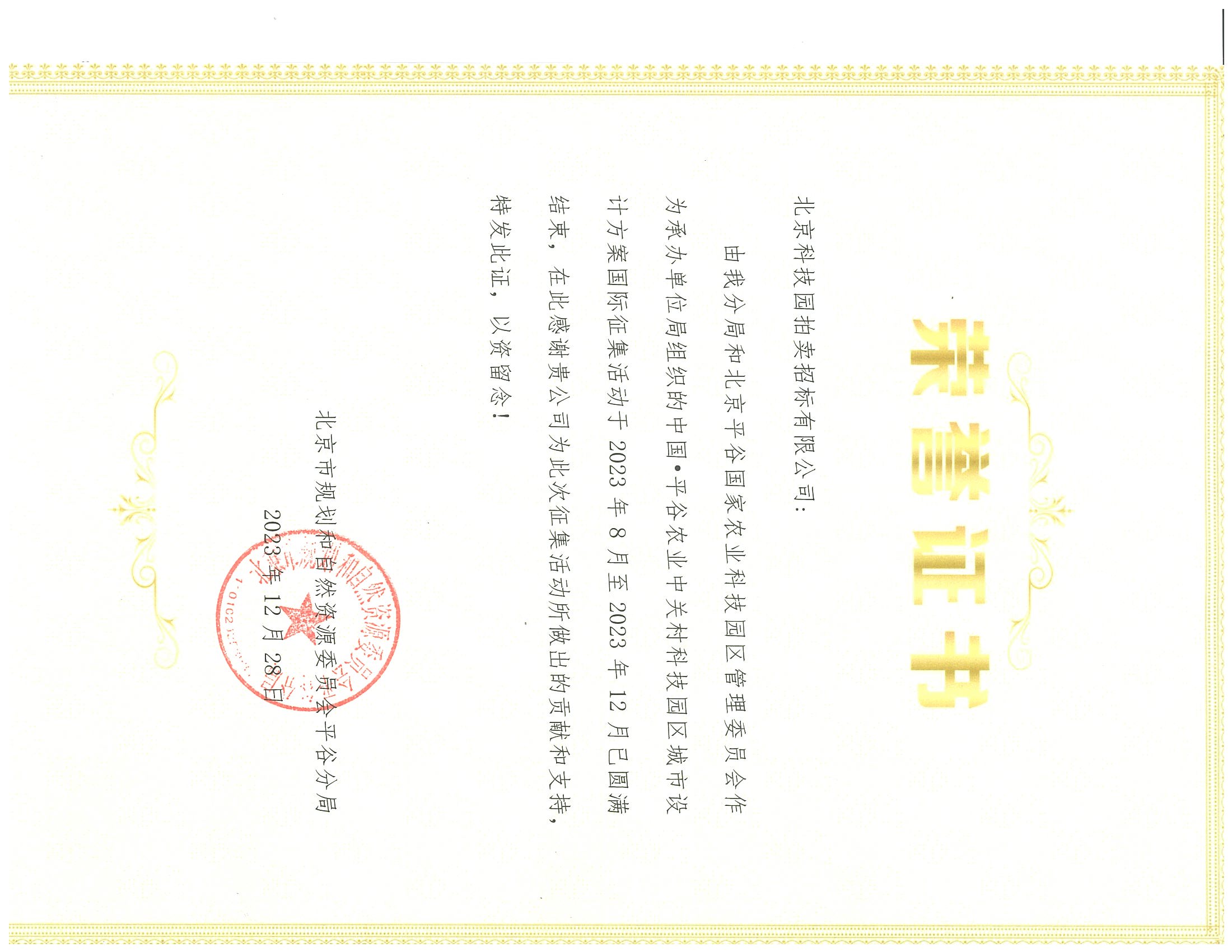 中國·平谷農(nóng)業(yè)中關(guān)村科技園區(qū)城市設(shè)計方案國際征集榮譽證書