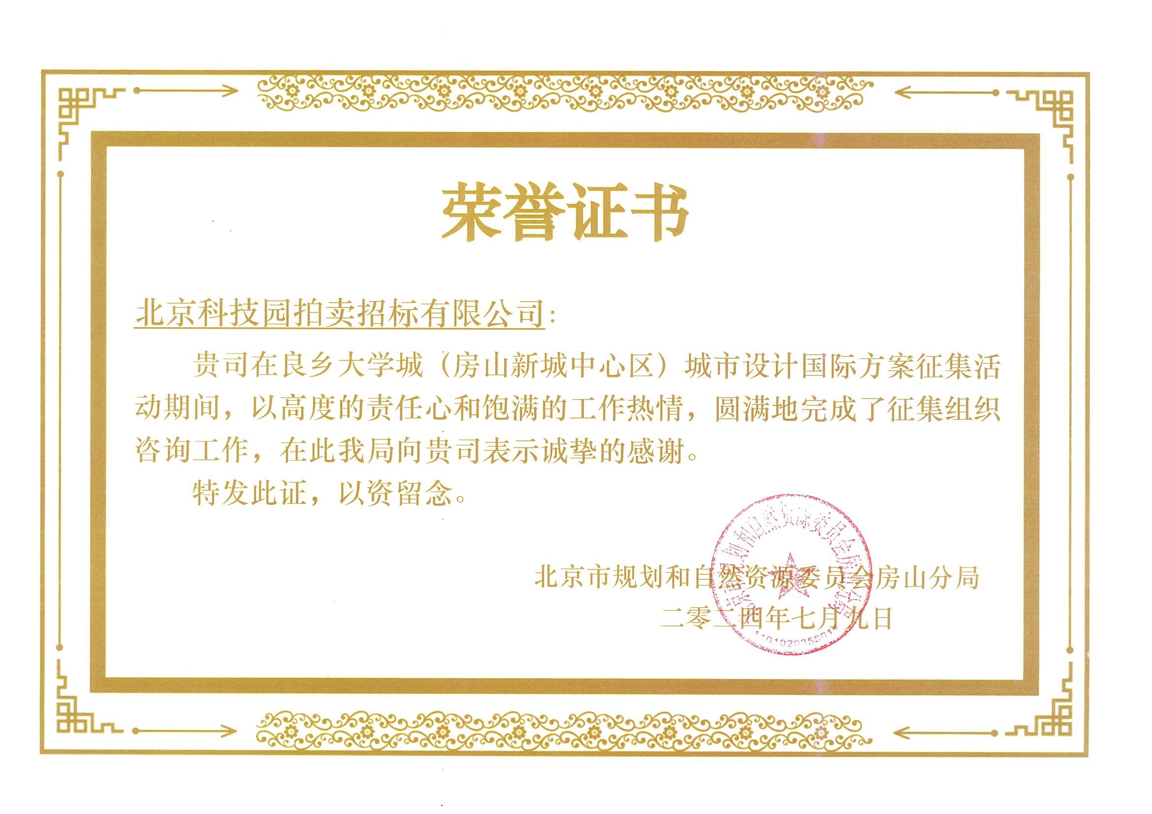 良鄉(xiāng)大學(xué)城(房山新城中心區(qū))城市設(shè)計國際方案征集榮譽證書