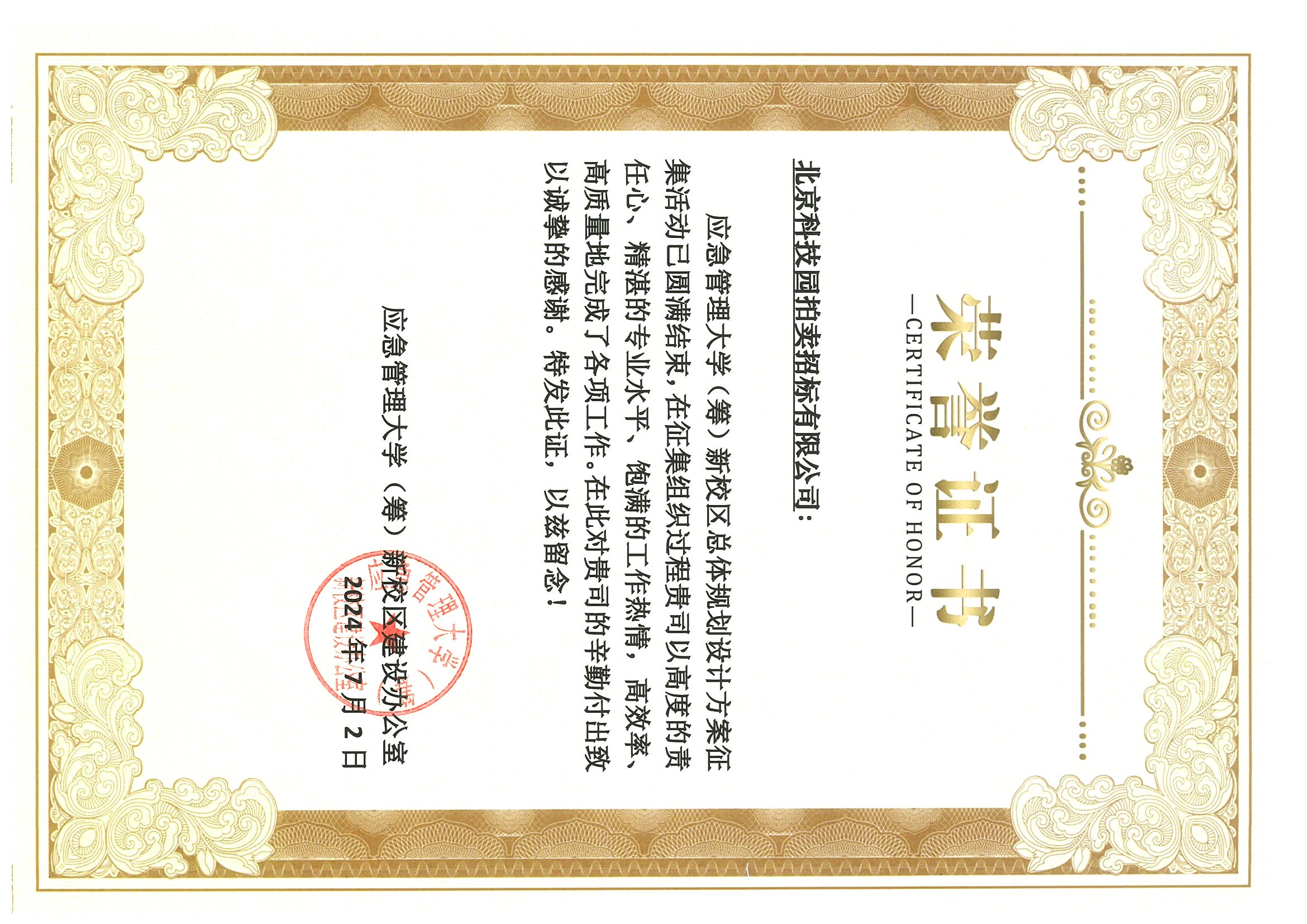 應(yīng)急管理大學(xué)(籌)新校區(qū)總體規(guī)劃設(shè)計方案征集榮譽證書