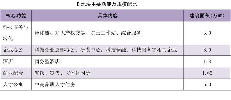 核心功能:科技服務與轉(zhuǎn)化、企業(yè)辦公、酒店、商業(yè)配套、人才公寓。